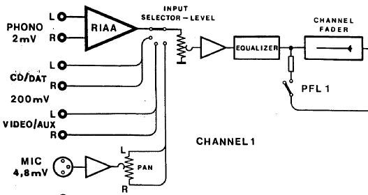 Naast de microfooningang bezit elke ingangsmodule tevens een aantal lijningangen . Deze lijningangen (CD/DAT, VIDEO/AUX) zijn geschikt om signalen met een hoog niveau rechtstreeks in de mengtafel te brengen. Aangezien deze signalen sterk genoeg zijn hoeven ze niet meer via de voorversterker te passeren en worden ze dan ook meteen aangeboden aan de volgende trap. En dat is een regelbare trim-preamp, laat het ons zo noemen, maar beter bekend als de naam GAIN . Hiermee kan het binnenkomende signaal geregeld worden binnen een beperkte versterkings- en/of verzwakkingsmarge (meestal ± 10 dB).