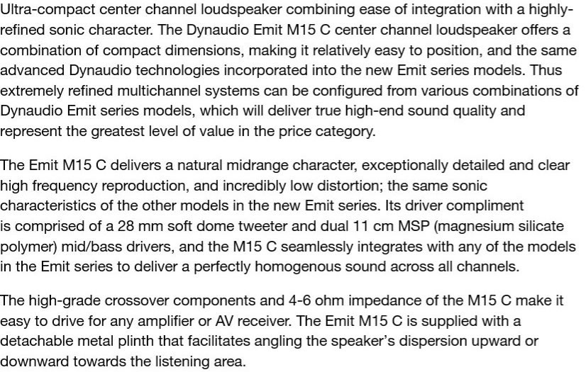 Advanced Dynaudio driver technologies coupled with Dynaudio’s renowned Danish craftsmanship highlight the new Emit series. As is typical of Dynaudio, each Emit model features drivers designed solely for the purpose of optimised performance within the constraints of the model’s particular application, thereby enabling a level of performance that is unrivalled in its category. From an aesthetic standpoint, the Emit models exhibit simply elegant Danish design and exceptional Dynaudio build quality, while sonically they deliver incredible dynamics, extremely high levels of transparency and detail, and very powerful bass extension. Imaging and sound-staging capabilities are also exceptional, and the sonic cohesion between the various models in the series ensures perfectly homogenous multi-channel system integration.