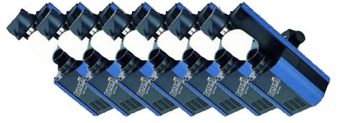 Set van 6 zéér compacte scanners in flightcase voorzien van 10 veelkleurige gobo's met fantastische lichtshows die meegaan op de muziek + kabels.